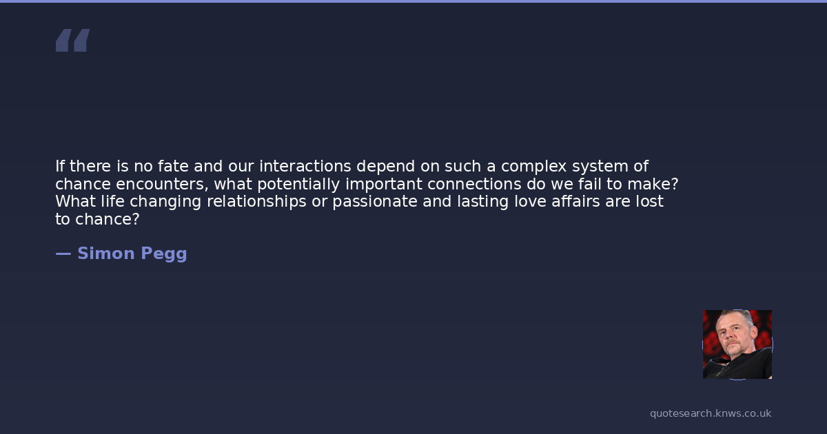 If there is no fate and our interactions depend on such a complex system of chance encounters, what potentially important connections do we fail to make? What life changing relationships or passionate and lasting love affairs are lost to chance?