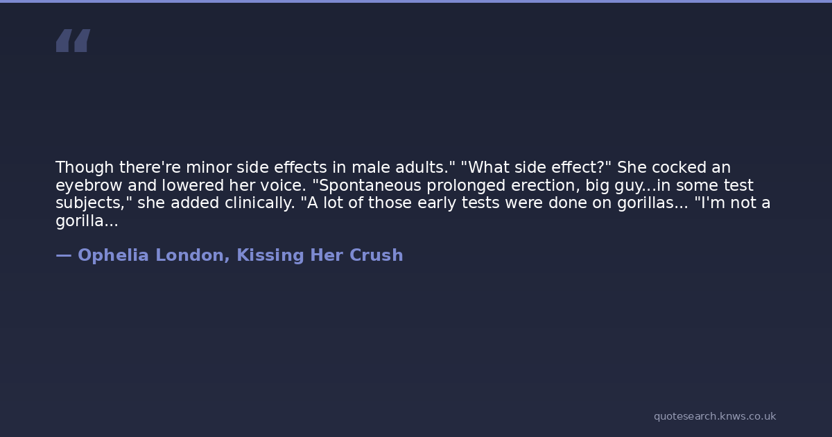 Though there're minor side effects in male adults." "What side effect?" She cocked an eyebrow and lowered her voice. "Spontaneous prolonged erection, big guy...in some test subjects," she added clinically. "A lot of those early tests were done on gorillas... "I'm not a gorilla." She glanced down the front of his lab coat. "Not yet.