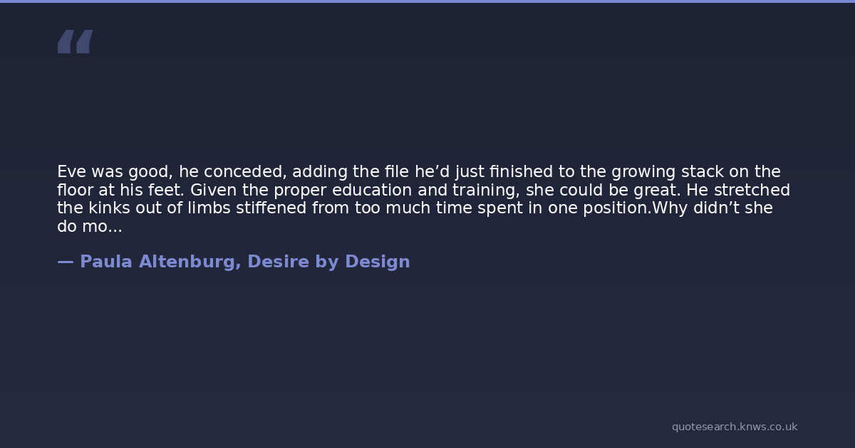 Eve was good, he conceded, adding the file he’d just finished to the growing stack on the floor at his feet. Given the proper education and training, she could be great. He stretched the kinks out of limbs stiffened from too much time spent in one position.Why didn’t she do more with her talent?He started to ask her, then realized she was sound asleep, curled up in the overstuffed chair. The sun no longer shone through the front window, and his stomach told him it was getting close to lunchtime, but she looked so adorable curled up with her hands under her cheek and her tanned knees against her chest that Matt was in no hurry to leave.