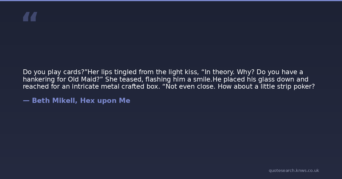 Do you play cards?”Her lips tingled from the light kiss, “In theory. Why? Do you have a hankering for Old Maid?” She teased, flashing him a smile.He placed his glass down and reached for an intricate metal crafted box. “Not even close. How about a little strip poker?