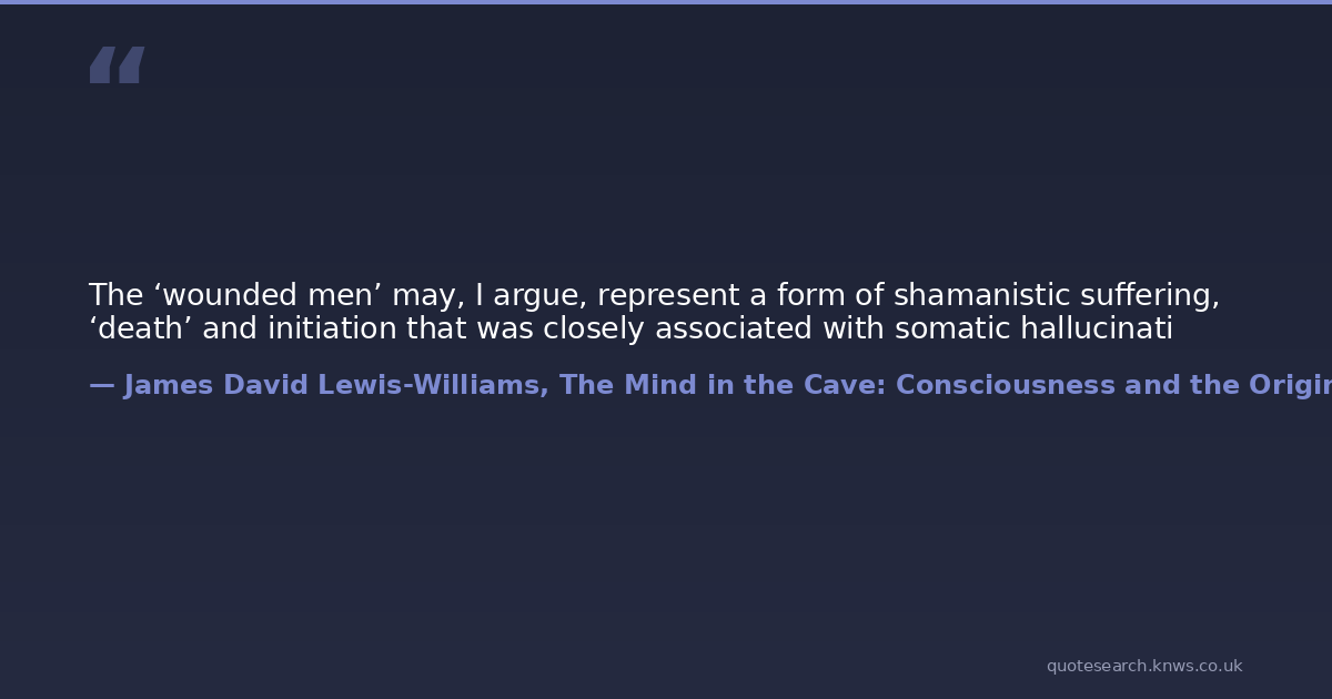 The ‘wounded men’ may, I argue, represent a form of shamanistic suffering, ‘death’ and initiation that was closely associated with somatic hallucinati