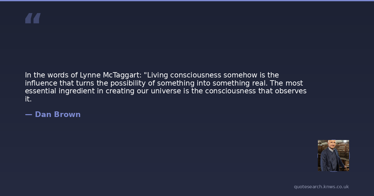 In the words of Lynne McTaggart: "Living consciousness somehow is the influence that turns the possibility of something into something real. The most essential ingredient in creating our universe is the consciousness that observes it.