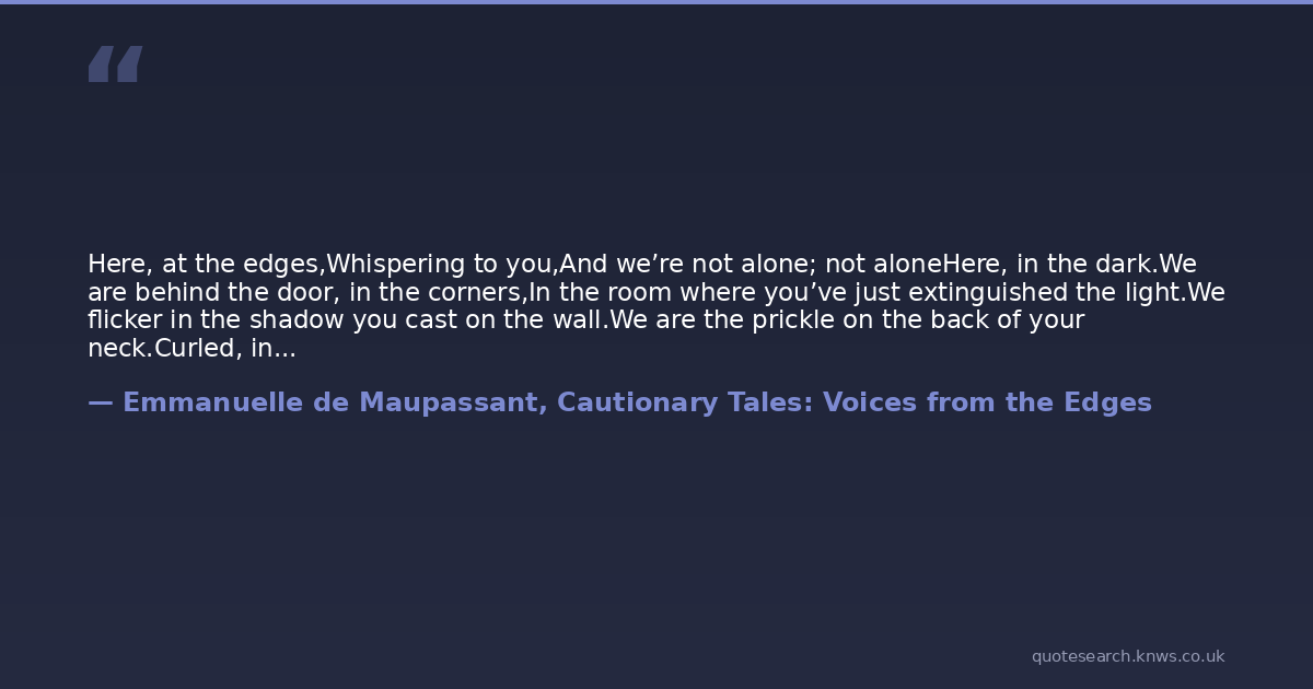 Here, at the edges,Whispering to you,And we’re not alone; not aloneHere, in the dark.We are behind the door, in the corners,In the room where you’ve just extinguished the light.We flicker in the shadow you cast on the wall.We are the prickle on the back of your neck.Curled, in words unspoken,We are the shiver on your uneasy flesh,The creep of the unknown on your skin.Can you feel us?Here, at the edges.From the Foreword of Cautionary Tales - by Emmanuelle de Maupassant