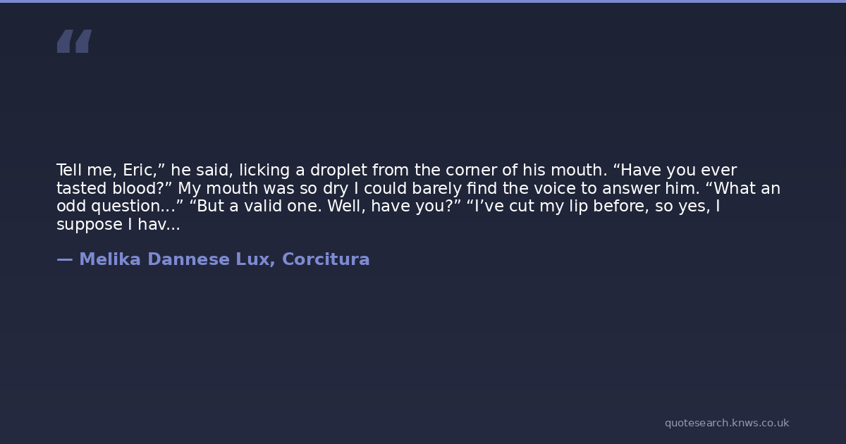 Tell me, Eric,” he said, licking a droplet from the corner of his mouth. “Have you ever tasted blood?” My mouth was so dry I could barely find the voice to answer him. “What an odd question...” “But a valid one. Well, have you?” “I’ve cut my lip before, so yes, I suppose I have tasted blood, but...” “Not your own, you foolish boy.” He let out a short, derisive laugh and leaned in so that he was only a few inches from my face. “I mean the blood of another.” “Good God, Stefan, of course not!” “Pity...