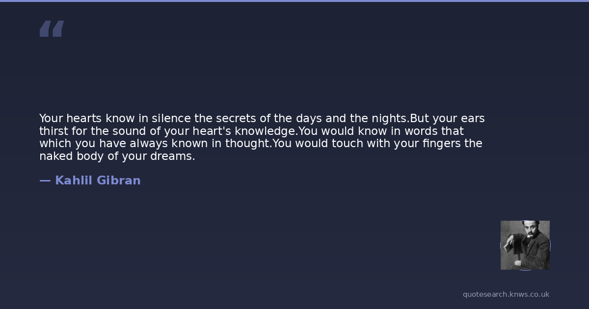 Your hearts know in silence the secrets of the days and the nights.But your ears thirst for the sound of your heart's knowledge.You would know in words that which you have always known in thought.You would touch with your fingers the naked body of your dreams.