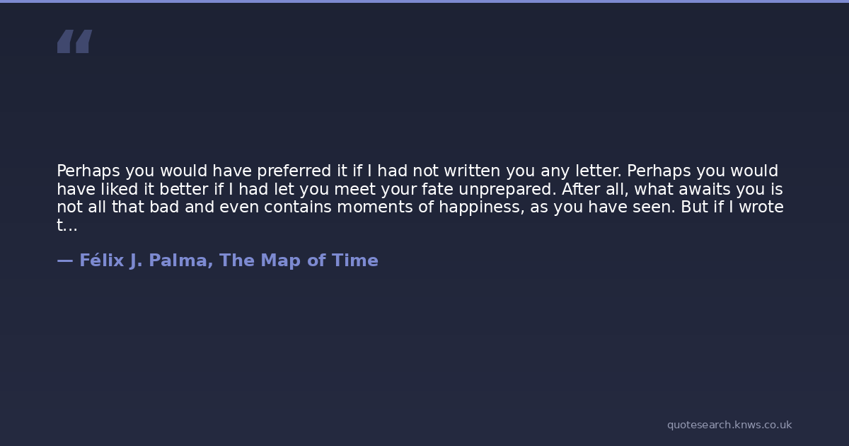 Perhaps you would have preferred it if I had not written you any letter. Perhaps you would have liked it better if I had let you meet your fate unprepared. After all, what awaits you is not all that bad and even contains moments of happiness, as you have seen. But if I wrote to you, it is because somehow I feel this is not the life you should live. Indeed, perhaps you should stay in the past, living happily with Jane and turning me into a successful writer who knows nothing about journeys through time, not real ones anyway. For me it is too late, of course, I cannot choose a different life, but you can. You can still choose between your life and the life I have just recounted to you, between going on being Bertie or becoming me. In the end, that is what time travel gives us, a second chance, the opportunity to go back and do things differently.