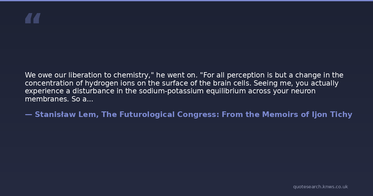 We owe our liberation to chemistry," he went on. "For all perception is but a change in the concentration of hydrogen ions on the surface of the brain cells. Seeing me, you actually experience a disturbance in the sodium-potassium equilibrium across your neuron membranes. So all we have todo is send a few well-chosen molecules down into those cortical mitochondria, activate the right neurohumoral-synaptic transmission effector sites, and your fondest dreams come true. But you knowall this," he concluded, subdued.