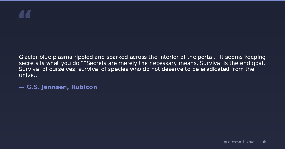 Glacier blue plasma rippled and sparked across the interior of the portal. “It seems keeping secrets is what you do.”“Secrets are merely the necessary means. Survival is the end goal. Survival of ourselves, survival of species who do not deserve to be eradicated from the universe. Survival of the universe itself.”“Survival’s noble and all, but what good is it without the freedom to live as you choose?”“A question you have the luxury to ask because you survive.