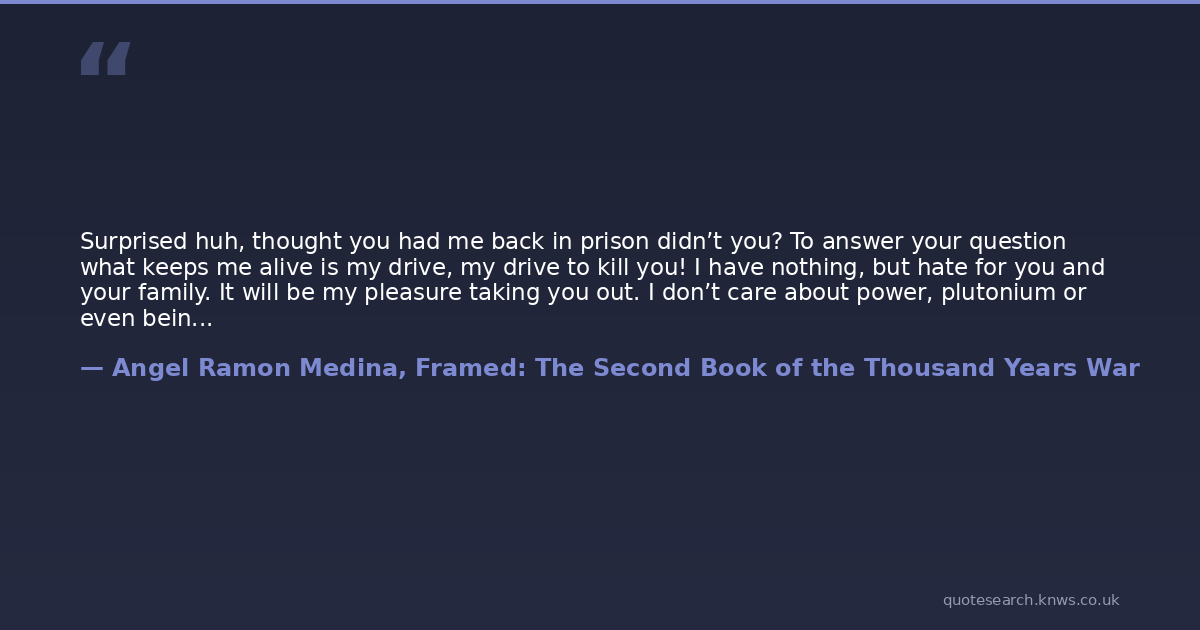 Surprised huh, thought you had me back in prison didn’t you? To answer your question what keeps me alive is my drive, my drive to kill you! I have nothing, but hate for you and your family. It will be my pleasure taking you out. I don’t care about power, plutonium or even being rich. None of that matters to me. I only care about taking you out. Even if I die I want to be the one who is called the killer of Angel Medina! There’s no where for you to go. Now we will truly see who is better! Come on put up you hands and prepare for your final battle of your life! - Orlando from Framed: The Second Book of the Thousand Years War