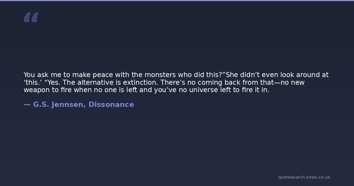 You ask me to make peace with the monsters who did this?”She didn’t even look around at ‘this.’ “Yes. The alternative is extinction. There’s no coming back from that—no new weapon to fire when no one is left and you’ve no universe left to fire it in.