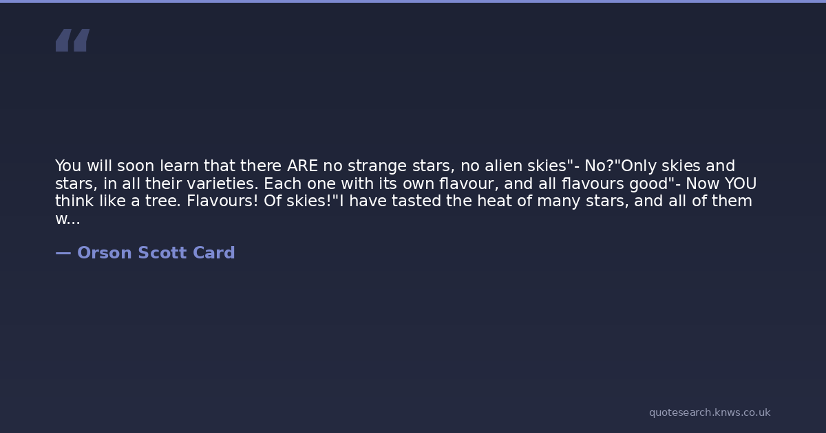 You will soon learn that there ARE no strange stars, no alien skies"- No?"Only skies and stars, in all their varieties. Each one with its own flavour, and all flavours good"- Now YOU think like a tree. Flavours! Of skies!"I have tasted the heat of many stars, and all of them were sweet