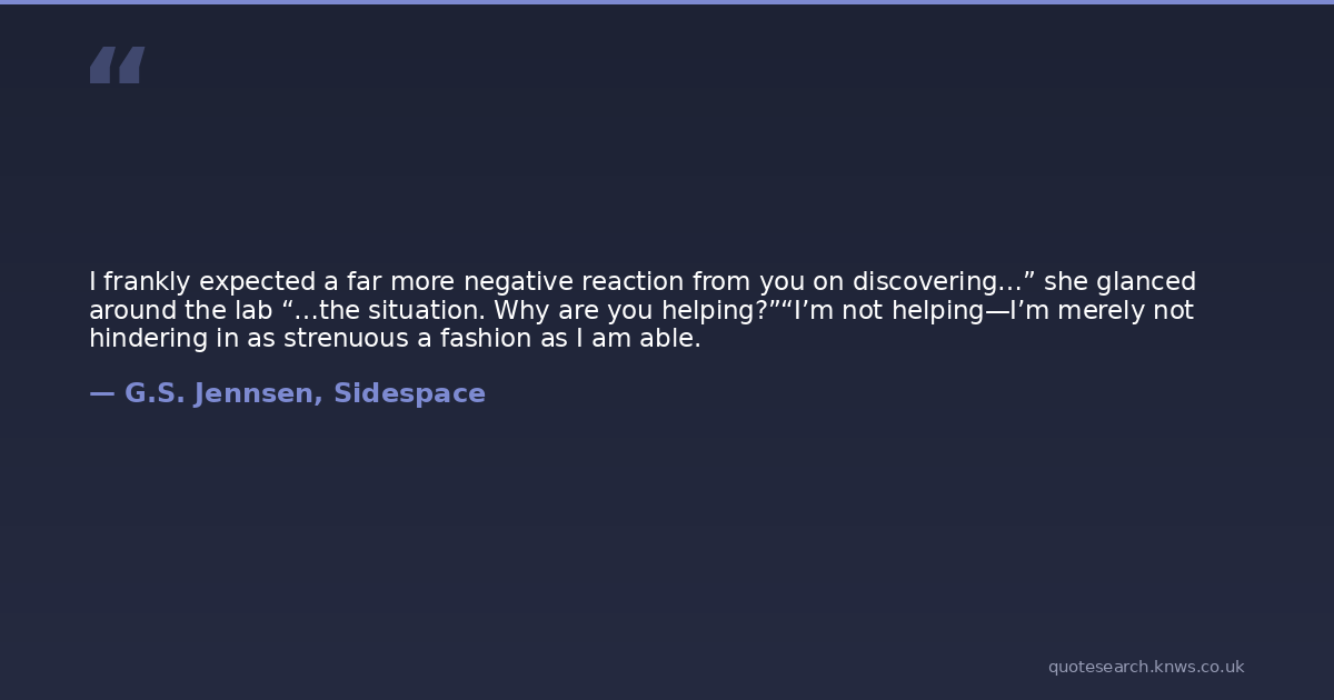 I frankly expected a far more negative reaction from you on discovering…” she glanced around the lab “…the situation. Why are you helping?”“I’m not helping—I’m merely not hindering in as strenuous a fashion as I am able.