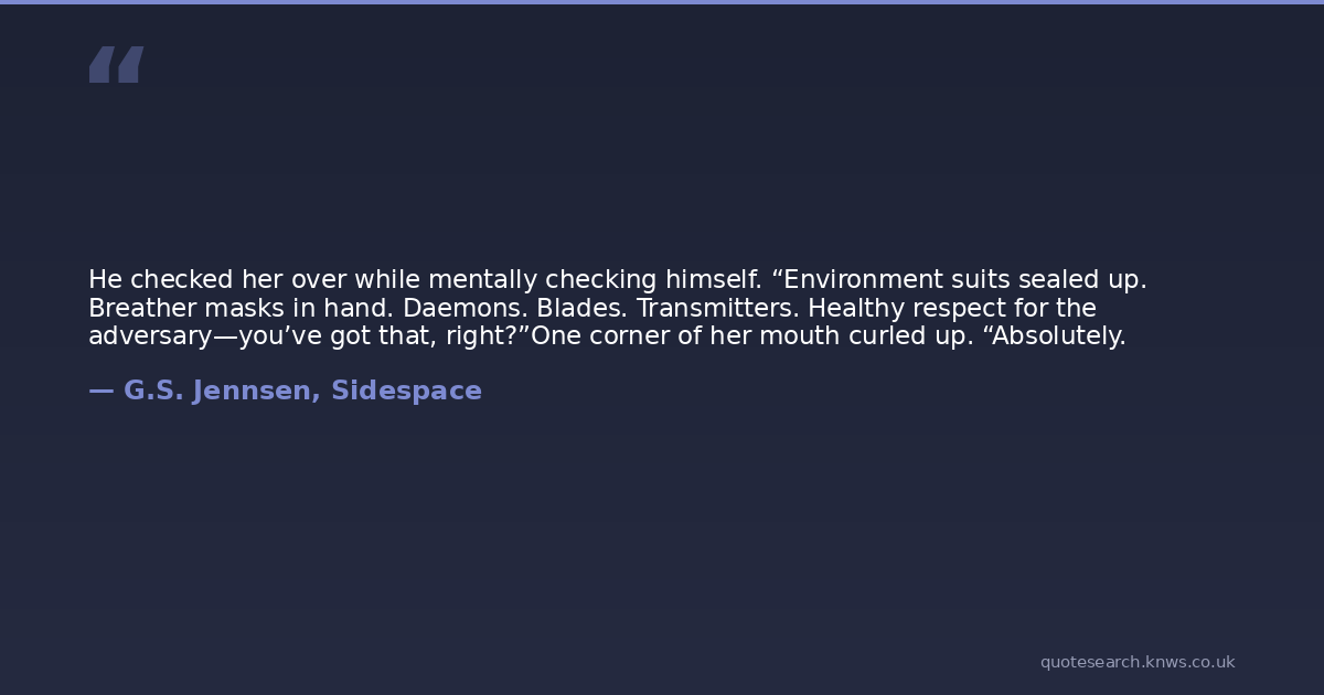 He checked her over while mentally checking himself. “Environment suits sealed up. Breather masks in hand. Daemons. Blades. Transmitters. Healthy respect for the adversary—you’ve got that, right?”One corner of her mouth curled up. “Absolutely.