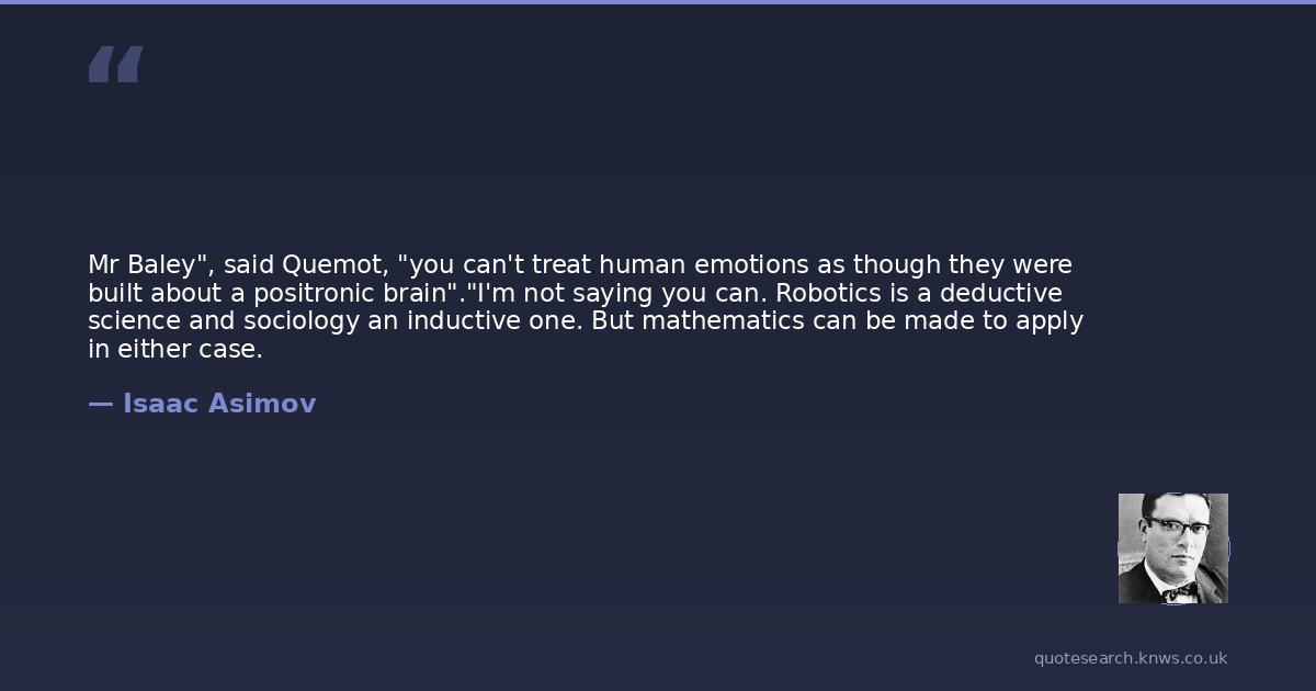 Mr Baley", said Quemot, "you can't treat human emotions as though they were built about a positronic brain"."I'm not saying you can. Robotics is a deductive science and sociology an inductive one. But mathematics can be made to apply in either case.