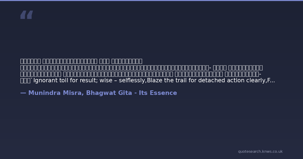 सक्ताः कर्मण्यविद्वांसो यथा कुर्वन्ति भारत।कुर्याद्विद्वांस्तथासक्तश्चिकीर्षुर्लोकसंग्रहम्॥॥३- २५॥न बुद्धिभेदं जनयेदज्ञानां कर्मसङ्गिनाम्।जोषयेत्सर्वकर्माणि विद्वान्युक्तः समाचरन्॥॥३- २६॥`Ignorant toil for result; wise – selflessly,Blaze the trail for detached action clearly,For the common weal, path to eternity,For the benefit of the entire humanity.’3. 25-26