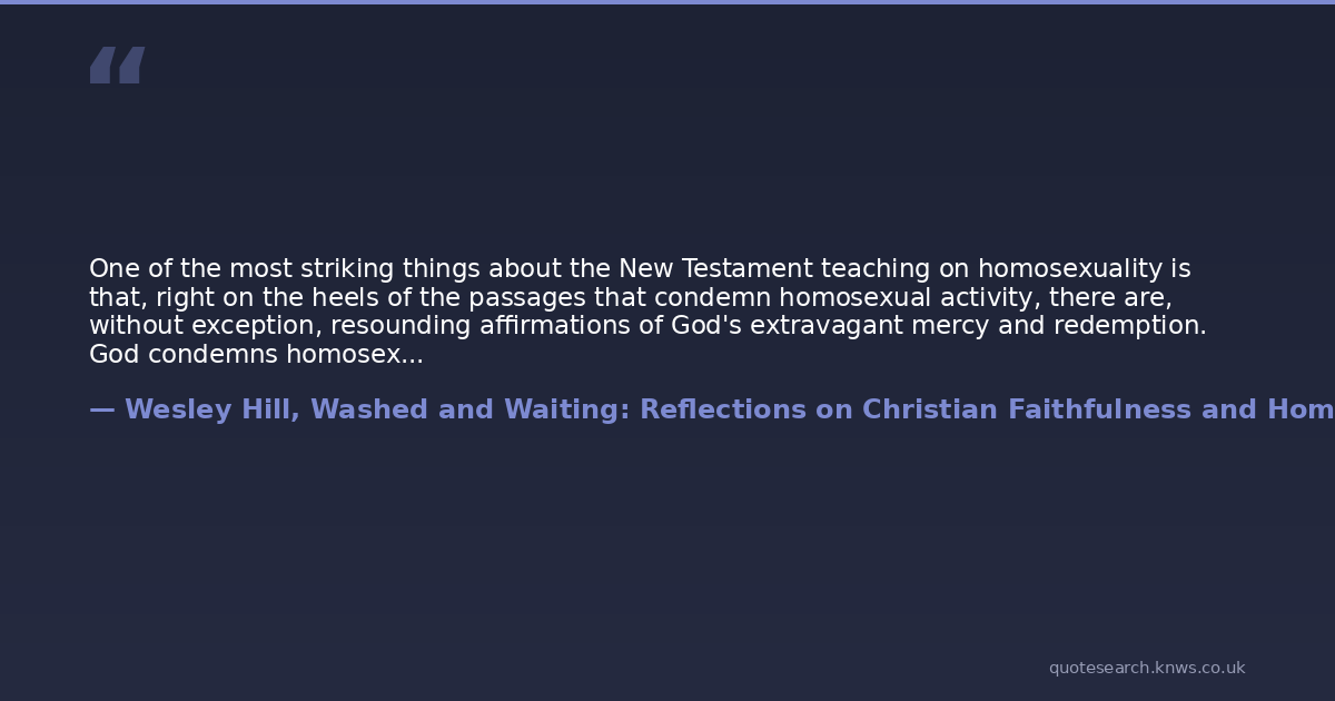 One of the most striking things about the New Testament teaching on homosexuality is that, right on the heels of the passages that condemn homosexual activity, there are, without exception, resounding affirmations of God's extravagant mercy and redemption. God condemns homosexual behavior and amazingly, profligately, at great cost to himself, lavishes his love on homosexual persons.