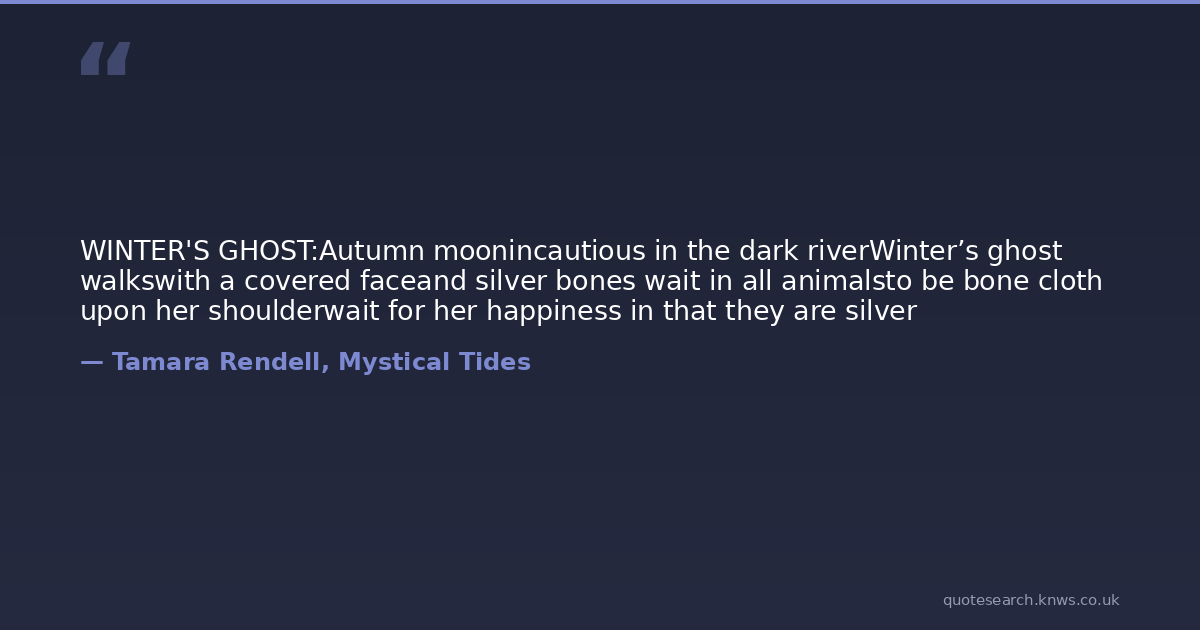 WINTER'S GHOST:Autumn moonincautious in the dark riverWinter’s ghost walkswith a covered faceand silver bones wait in all animalsto be bone cloth upon her shoulderwait for her happiness in that they are silver