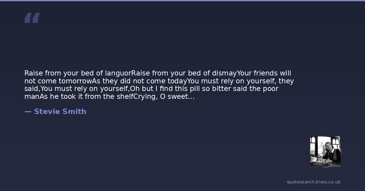 Stevie Smith was a 20th-century English poet and novelist. Florence Margaret Smith, known as Stevie Smith, was an English poet and novelist. She won the Cholmondeley Award and was awarded the Queen's Gold Medal for Poetry. Read more on Wikipedia →