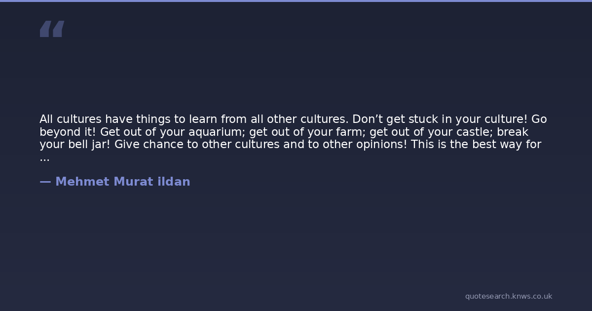 All cultures have things to learn from all other cultures. Don’t get stuck in your culture! Go beyond it! Get out of your aquarium; get out of your farm; get out of your castle; break your bell jar! Give chance to other cultures and to other opinions! This is the best way for you to see the insufficiencies, absurdities and stupidities in your culture!