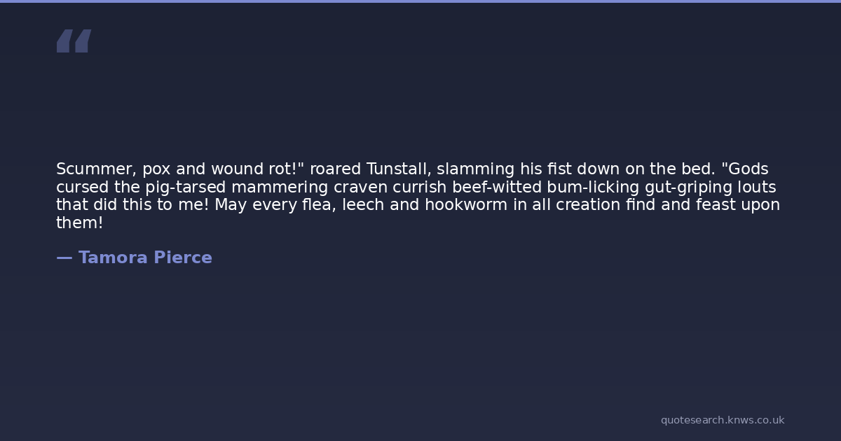 Scummer, pox and wound rot!" roared Tunstall, slamming his fist down on the bed. "Gods cursed the pig-tarsed mammering craven currish beef-witted bum-licking gut-griping louts that did this to me! May every flea, leech and hookworm in all creation find and feast upon them!