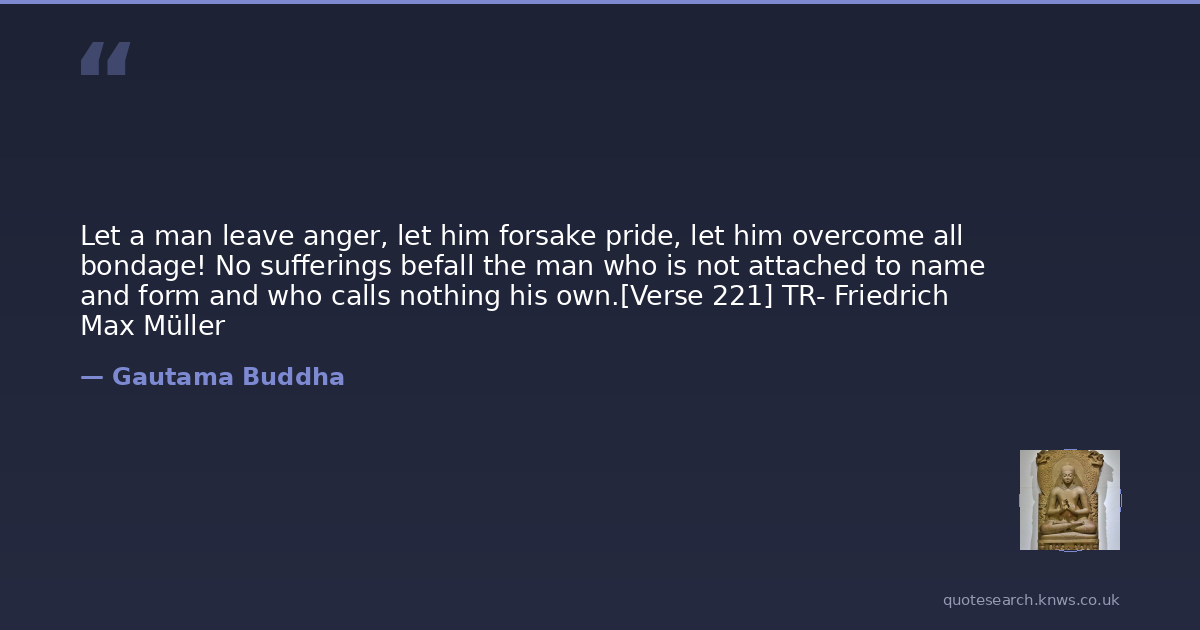 Let a man leave anger, let him forsake pride, let him overcome all bondage! No sufferings befall the man who is not attached to name and form and who calls nothing his own.[Verse 221] TR- Friedrich Max Müller