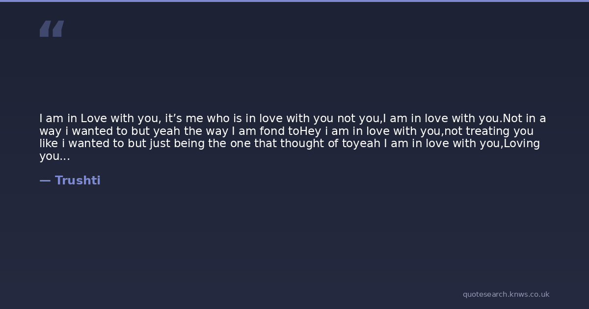I am in Love with you, it’s me who is in love with you not you,I am in love with you.Not in a way i wanted to but yeah the way I am fond toHey i am in love with you,not treating you like i wanted to but just being the one that thought of toyeah I am in love with you,Loving you was the secrete i wanted to keepand buried deep inside my emotional heap,Doing everything possible what i had toBut baby it hurts as it hurts you too,but yeah still i am in love with you,Pulled myself million times coz i got the wrong vibe all the time,but the truth remains the samebaby hear me as i am in love with you,Waiting on you I could see people were laughing on meI knew all the while you weren't near me.But you should know that I am in love with youThere were some days I missed you a lot and scared to tell you how i feel cold and hotfor you as i am in love with you is the only dreamAnd then I am in love with youi remember i have cried to sleepand bagged myself to keep you awayfrom the highest steepthe voice that said from within me I am in love with youJust I LOVE YOU was the only words I wanna hear from youeven while knowing, you don’t mean tocoz simply I feel the way I wanted toLoving to say i am in love with you.wake up in the morning with only you in my mind till i sleep at deep way in the nightI know its all silly things for your kindbut its perfect to me as clearly - deeply in love with youWhen you being nice to me that scares me sometimesbut bottom in my heart it feels so nice coz during that timei am in love with you,Doesn't matter whatever i do with you even things i have never done beforeand i enjoyed them all coz simply as I am in love with you.In the first waiting on you was the favorite thing in my dayweather it s a call or just a look from you from the farthest bayI asked myself why and the voice within me said that i am in love with you.