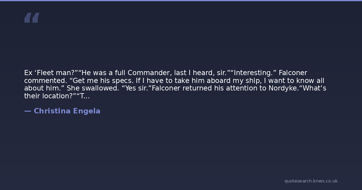 Ex ‘Fleet man?”“He was a full Commander, last I heard, sir.”“Interesting.” Falconer commented. “Get me his specs. If I have to take him aboard my ship, I want to know all about him.” She swallowed. “Yes sir.”Falconer returned his attention to Nordyke.“What’s their location?”“They’re about a week outside the Hermes system, Captain.”“Helm, set a course – best possible speed!”“Um – sir, we’re on conversion drive at the moment.” The helmsman reported.“I know, Linson – d’you think I’m senile?”“No, sir – I…” The young helmsman stammered.“I did say ‘best possible speed’, didn’t I?”“Yes, sir.