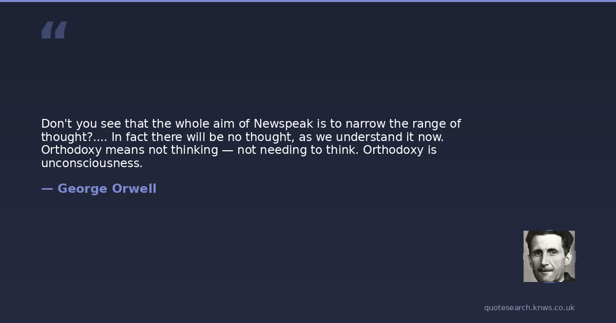 Don't you see that the whole aim of Newspeak is to narrow the range of thought?.... In fact there will be no thought, as we understand it now. Orthodoxy means not thinking — not needing to think. Orthodoxy is unconsciousness.
