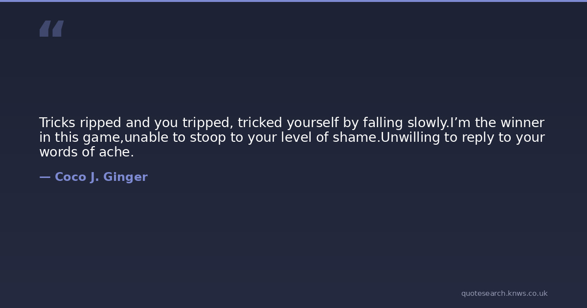 Tricks ripped and you tripped, tricked yourself by falling slowly.I’m the winner in this game,unable to stoop to your level of shame.Unwilling to reply to your words of ache.