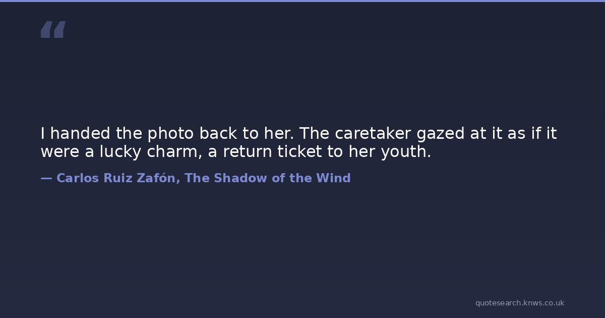 I handed the photo back to her. The caretaker gazed at it as if it were a lucky charm, a return ticket to her youth. memories nostalgia photographs Download Image Share on X Share on Facebook Copy Link