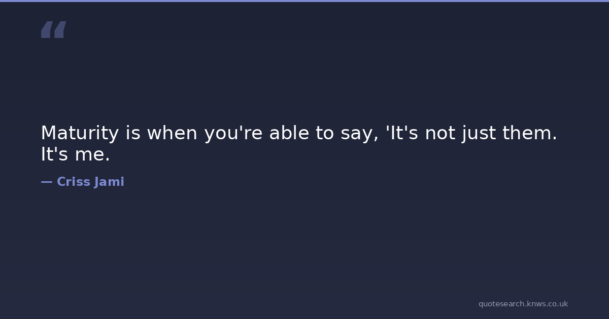 Maturity is when you're able to say, 'It's not just them. It's me. admittance arrogance confession development discernment ego errors faults honesty honor humility hypocrisy immaturity improvement insecurity insincere judgment maturity mistakes nobility pride repentance right security self-righteousness selfish selfless sin sincere wrong Download Image Share on X Share on Facebook Copy Link