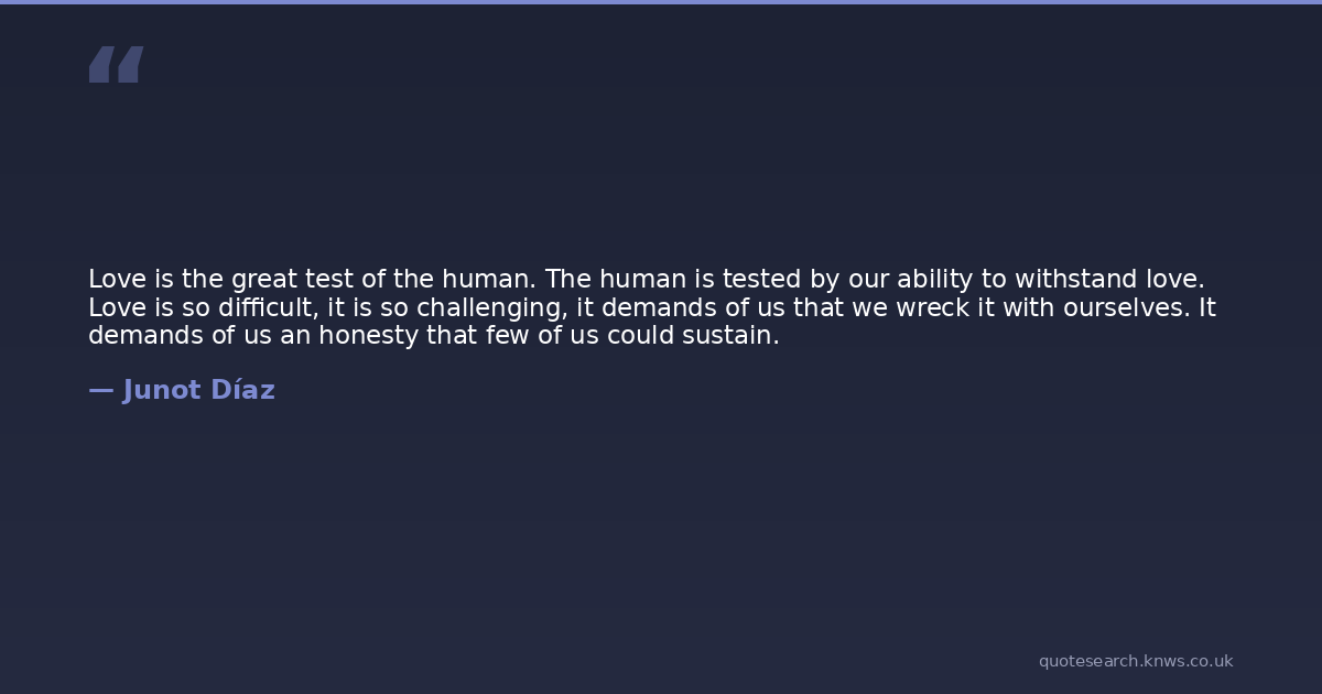 Love is the great test of the human. The human is tested by our ability to withstand love. Love is so difficult, it is so challenging, it demands of us that we wreck it with ourselves. It demands of us an honesty that few of us could sustain.