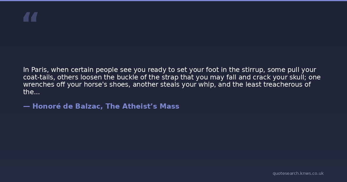 In Paris, when certain people see you ready to set your foot in the stirrup, some pull your coat-tails, others loosen the buckle of the strap that you may fall and crack your skull; one wrenches off your horse's shoes, another steals your whip, and the least treacherous of them all is the man whom you see coming to fire his pistol at you point blank.