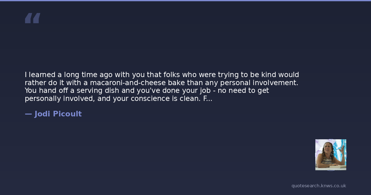 I learned a long time ago with you that folks who were trying to be kind would rather do it with a macaroni-and-cheese bake than any personal involvement. You hand off a serving dish and you've done your job - no need to get personally involved, and your conscience is clean. Food is the currency of aid.