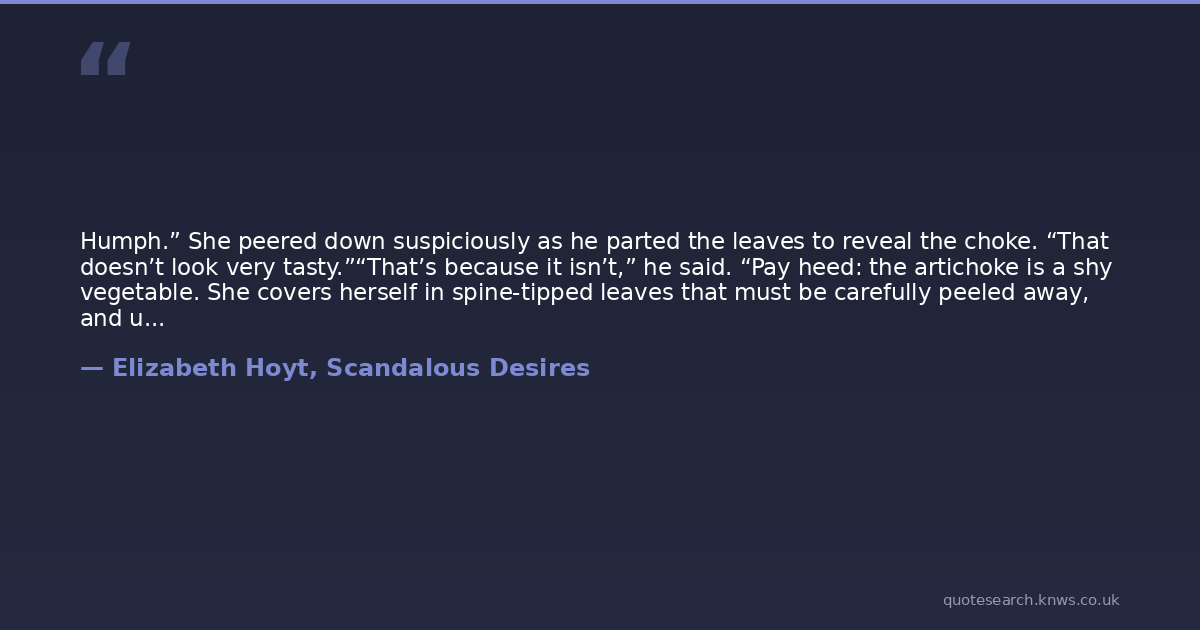 Humph.” She peered down suspiciously as he parted the leaves to reveal the choke. “That doesn’t look very tasty.”“That’s because it isn’t,” he said. “Pay heed: the artichoke is a shy vegetable. She covers herself in spine-tipped leaves that must be carefully peeled away, and underneath shields her treasure with a barricade o’ soft needles. They must be tenderly, but firmly, scraped aside. Ye must be bold, for if yer not, she’ll never reveal her soft heart.”He finished cutting away the thistles and placed the small, tender heart on the center of her plate.She wrinkled her nose. “That’s it? But it’s so small.”“Ah, and d’ye judge a thing solely upon size alone?”She made a choking sound.