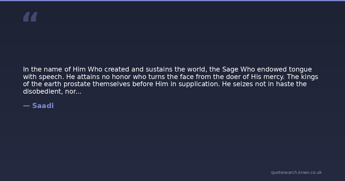 In the name of Him Who created and sustains the world, the Sage Who endowed tongue with speech. He attains no honor who turns the face from the doer of His mercy. The kings of the earth prostate themselves before Him in supplication. He seizes not in haste the disobedient, nor drives away the penitent with violence. The two worlds are as a drop of water in the ocean of His knowledge. He withholds not His bounty though His servants sin; upon the surface of the earth has He spread a feast, in which both friend and foe may share. Peerless He is, and His kingdom is eternal. Upon the head of one He placed a crown another he hurled from the throne to the ground. The fire of His friend He turned into a flower garden; through the water of the Nile He sended His foes to perdition. Behind the veil He sees all, and concealed our faults with His own goodness. He is near to them that are downcast, and accepts the prayers of them that lament. He knows of the things that exist not, of secrets that are untold. He causes the moon and the sun to revolve, and spreads water upon the earth. In the heart of a stone hath He placed a jewel; from nothing had He created all that is. Who can reveal the secret of His qualities; what eye can see the limits of His beauty? The bird of thought cannot soar to the height of His presence, nor the hand of understanding reach to the skirt of His praise. Think not, O Saadi, that one can walk in the road of purity except in the footsteps of Mohammed (Peace and Blessings be Upon Him)