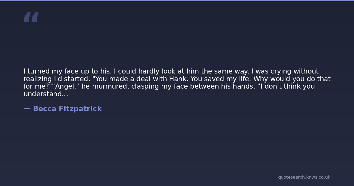 I turned my face up to his. I could hardly look at him the same way. I was crying without realizing I'd started. "You made a deal with Hank. You saved my life. Why would you do that for me?""Angel," he murmured, clasping my face between his hands. "I don't think you understand the lengths I would go to if it means keeping you here with me.