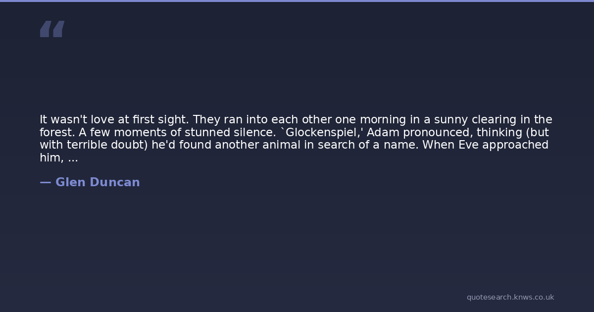 It wasn't love at first sight. They ran into each other one morning in a sunny clearing in the forest. A few moments of stunned silence. `Glockenspiel,' Adam pronounced, thinking (but with terrible doubt) he'd found another animal in search of a name. When Eve approached him, proffering a handful of elderberries, he threw a stick at her and ran away.