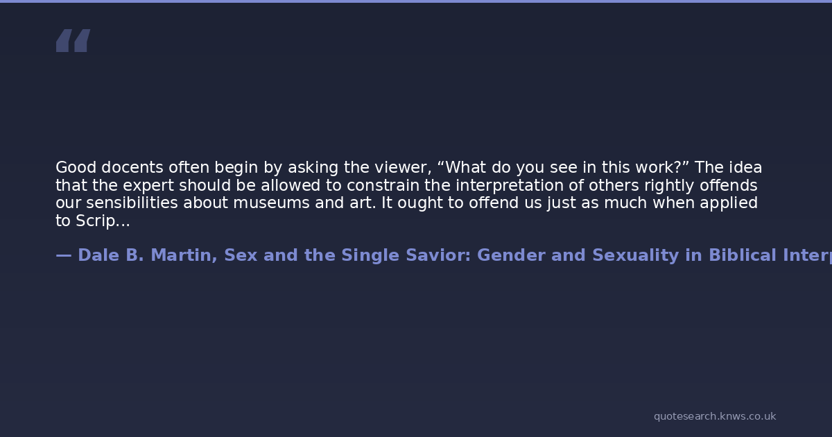 Good docents often begin by asking the viewer, “What do you see in this work?” The idea that the expert should be allowed to constrain the interpretation of others rightly offends our sensibilities about museums and art. It ought to offend us just as much when applied to Scripture.
