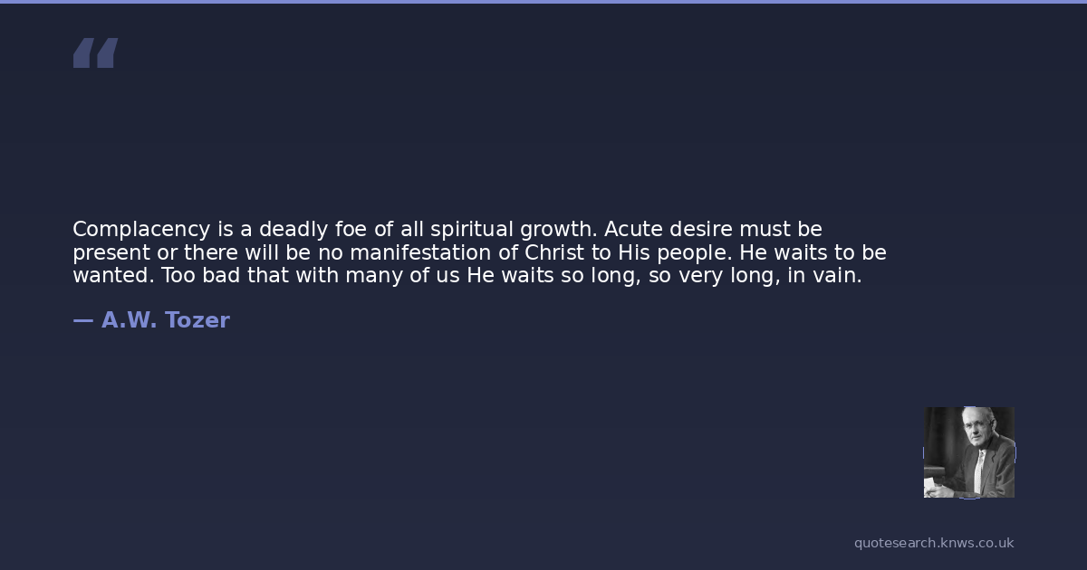 Complacency is a deadly foe of all spiritual growth. Acute desire must be present or there will be no manifestation of Christ to His people. He waits to be wanted. Too bad that with many of us He waits so long, so very long, in vain.