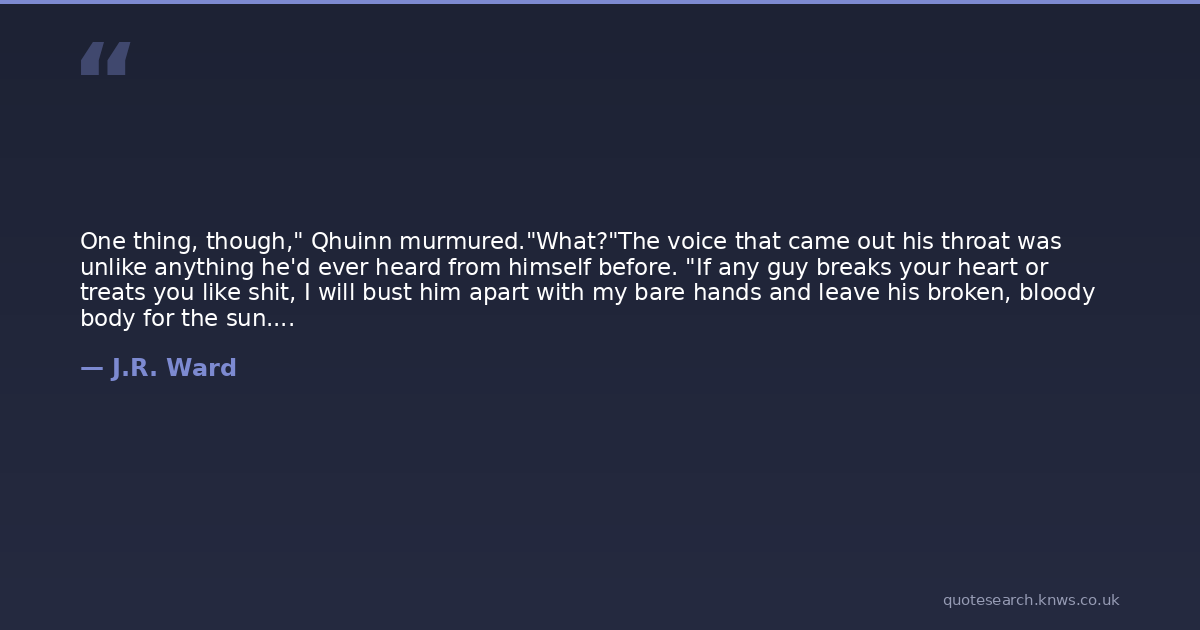 One thing, though," Qhuinn murmured."What?"The voice that came out his throat was unlike anything he'd ever heard from himself before. "If any guy breaks your heart or treats you like shit, I will bust him apart with my bare hands and leave his broken, bloody body for the sun."Blay's laughter rumbled around the tiled walls. "Of course you will--""I'm dead fucking serious."Blay's blue eyes shot over his shoulder."If there are any who dare to hurt you," Qhuinn growled in the Old Language, "I shall see them staked afore me and shall leave their bodies in ruin.