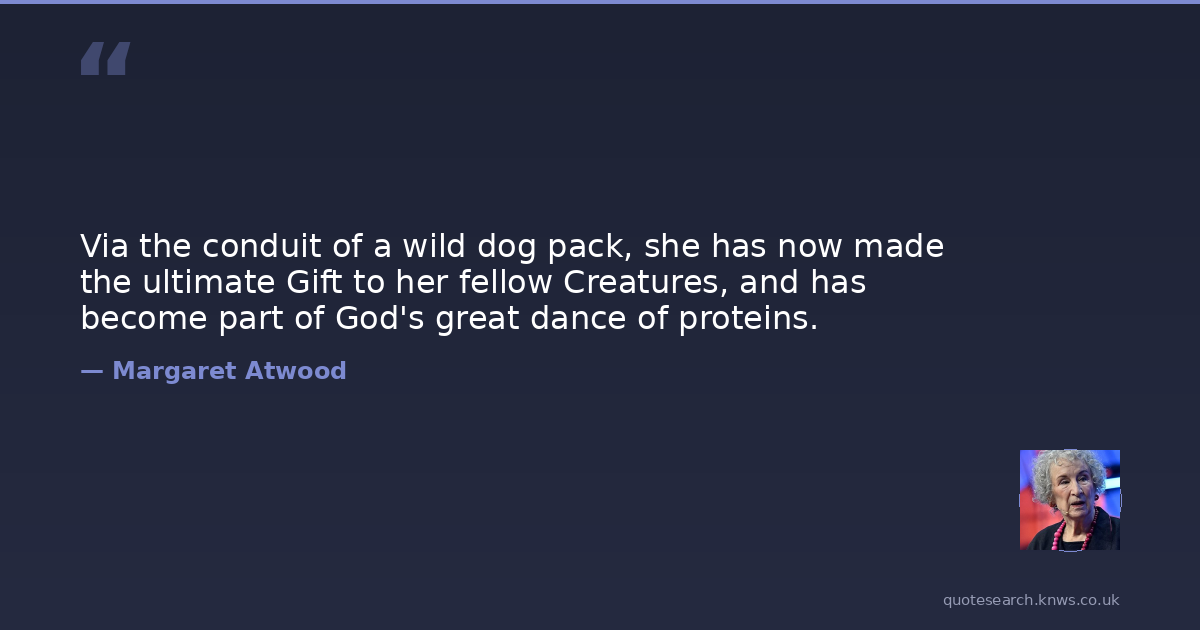 Via the conduit of a wild dog pack, she has now made the ultimate Gift to her fellow Creatures, and has become part of God's great dance of proteins.