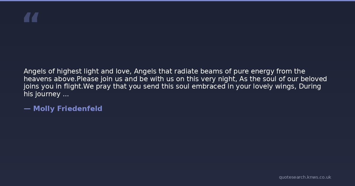 Angels of highest light and love, Angels that radiate beams of pure energy from the heavens above.Please join us and be with us on this very night, As the soul of our beloved joins you in flight.We pray that you send this soul embraced in your lovely wings, During his journey may he hear harps, and trumpets and strings.