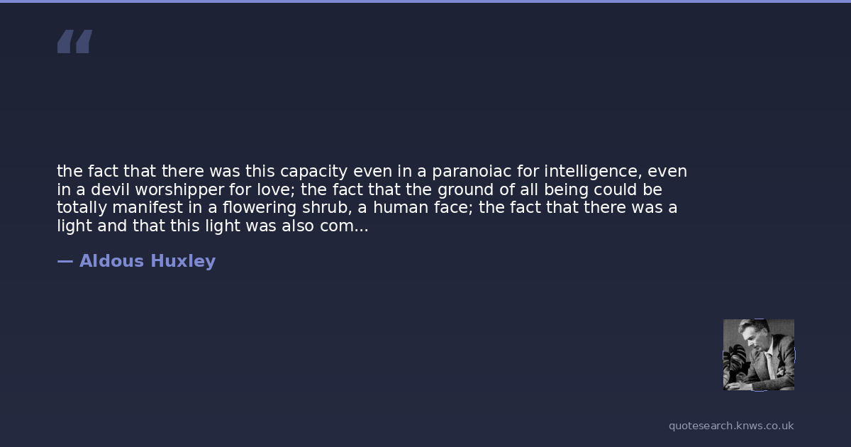 the fact that there was this capacity even in a paranoiac for intelligence, even in a devil worshipper for love; the fact that the ground of all being could be totally manifest in a flowering shrub, a human face; the fact that there was a light and that this light was also compassion.