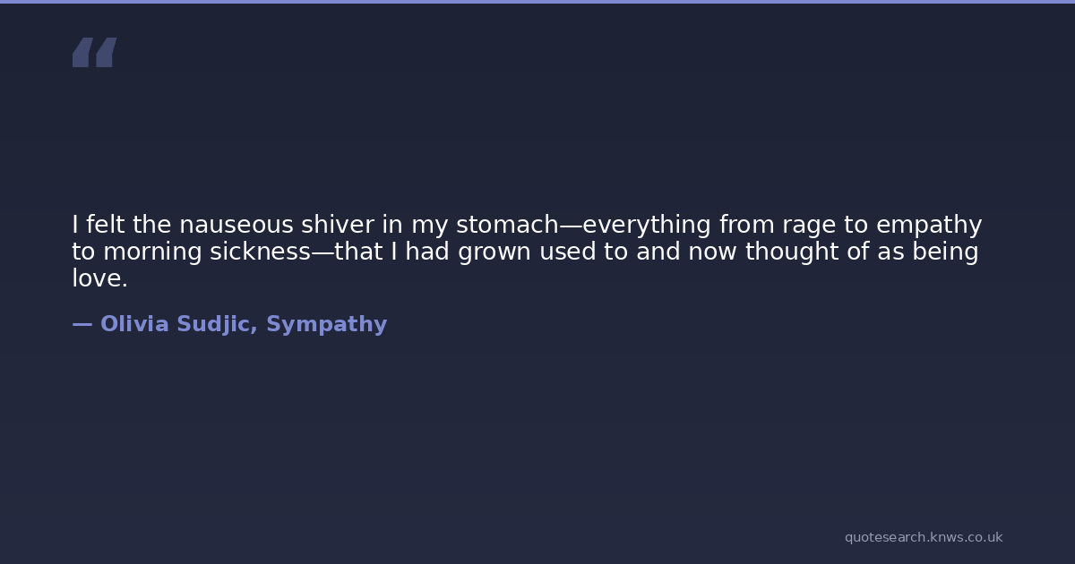 I felt the nauseous shiver in my stomach—everything from rage to empathy to morning sickness—that I had grown used to and now thought of as being love.