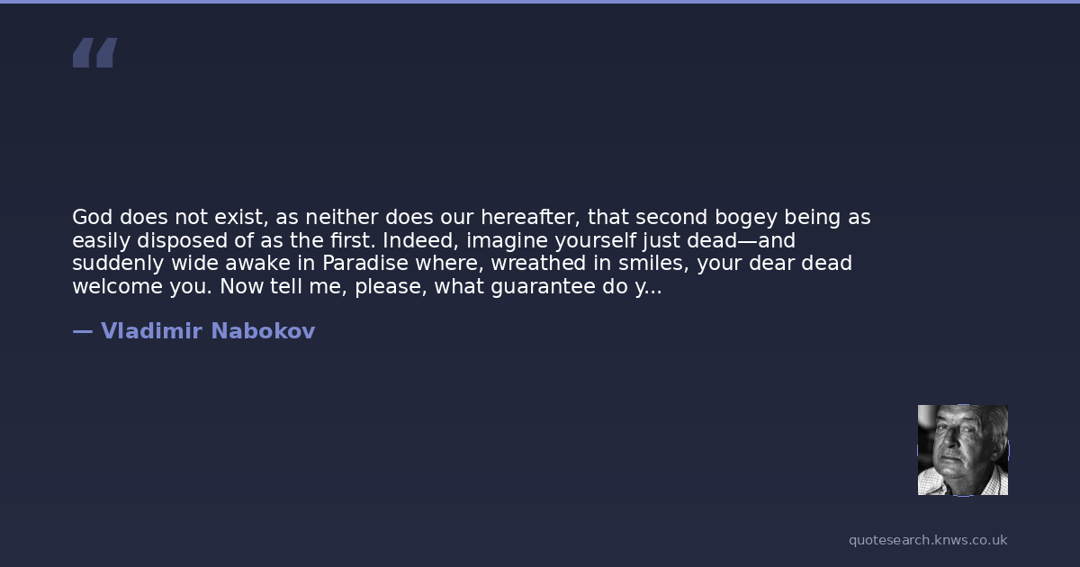 God does not exist, as neither does our hereafter, that second bogey being as easily disposed of as the first. Indeed, imagine yourself just dead—and suddenly wide awake in Paradise where, wreathed in smiles, your dear dead welcome you. Now tell me, please, what guarantee do you possess that those beloved ghosts are genuine; that it is really your dear dead mother and not some petty demon mystifying you, masked as your mother and impersonating her with consummate art and naturalness? There is the rub, there is the horror; the more so as the acting will go on and on, endlessly; never, never, never, never, never will your soul in that other world be quite sure that the sweet gentle spirits crowding about it are not fiends in disguise, and forever, and forever, and forever shall your soul remain in doubt, expecting every moment some awful change, some diabolical sneer to disfigure the dear face bending over you.