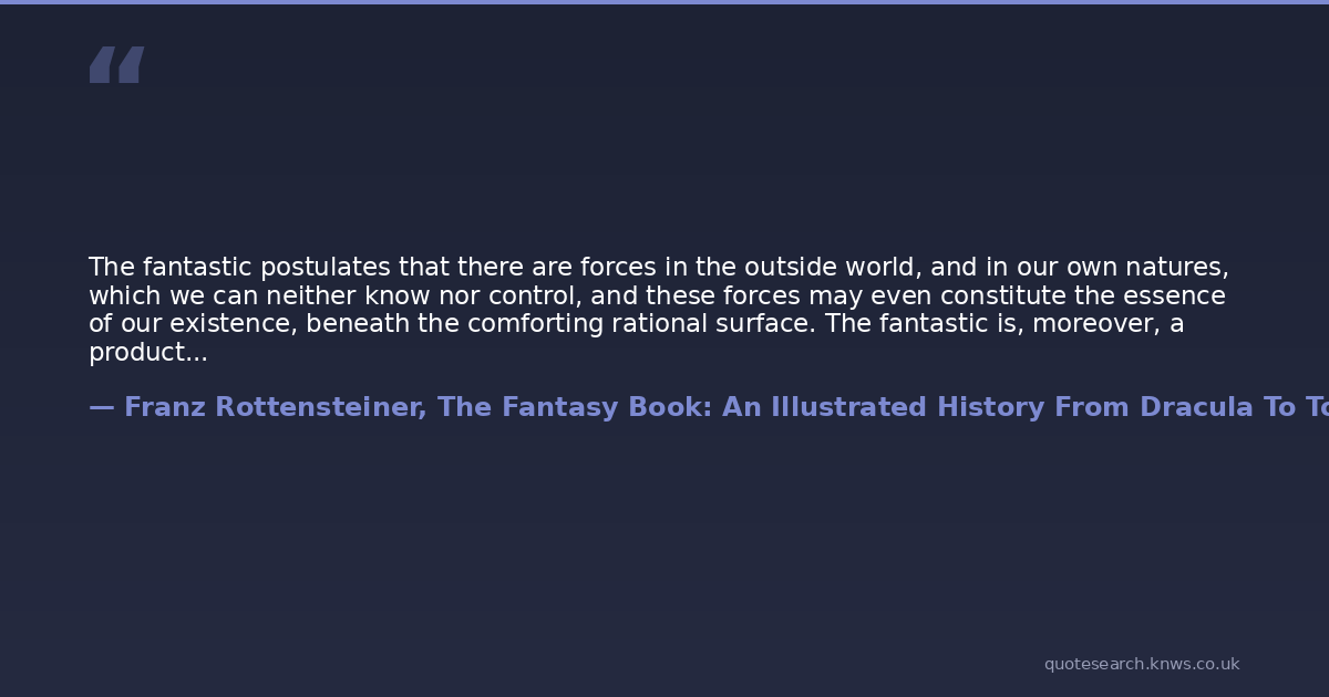 The fantastic postulates that there are forces in the outside world, and in our own natures, which we can neither know nor control, and these forces may even constitute the essence of our existence, beneath the comforting rational surface. The fantastic is, moreover, a product of human imagination, perhaps even an excess of imagination. It arises when laws thought to be absolute are transcended, in the borderland between life and death, the animate and the inanimate, the self and the world; it arises when the real turns into the unreal, and the solid presence into vision, dream or hallucination. The fantastic is the unexpected occurrence, the startling novelty which goes contrary to all our expectations of what is possible. The ego multiplies and splits, time and space are distorted.