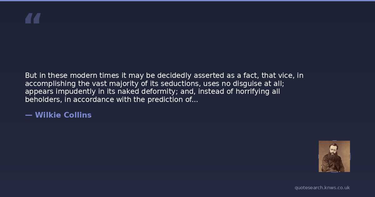 But in these modern times it may be decidedly asserted as a fact, that vice, in accomplishing the vast majority of its seductions, uses no disguise at all; appears impudently in its naked deformity; and, instead of horrifying all beholders, in accordance with the prediction of the classical satirist, absolutely attracts a much more numerous congregation of worshippers than has ever yet been brought together by the divinest beauties that virtue can display for the allurement of mankind.