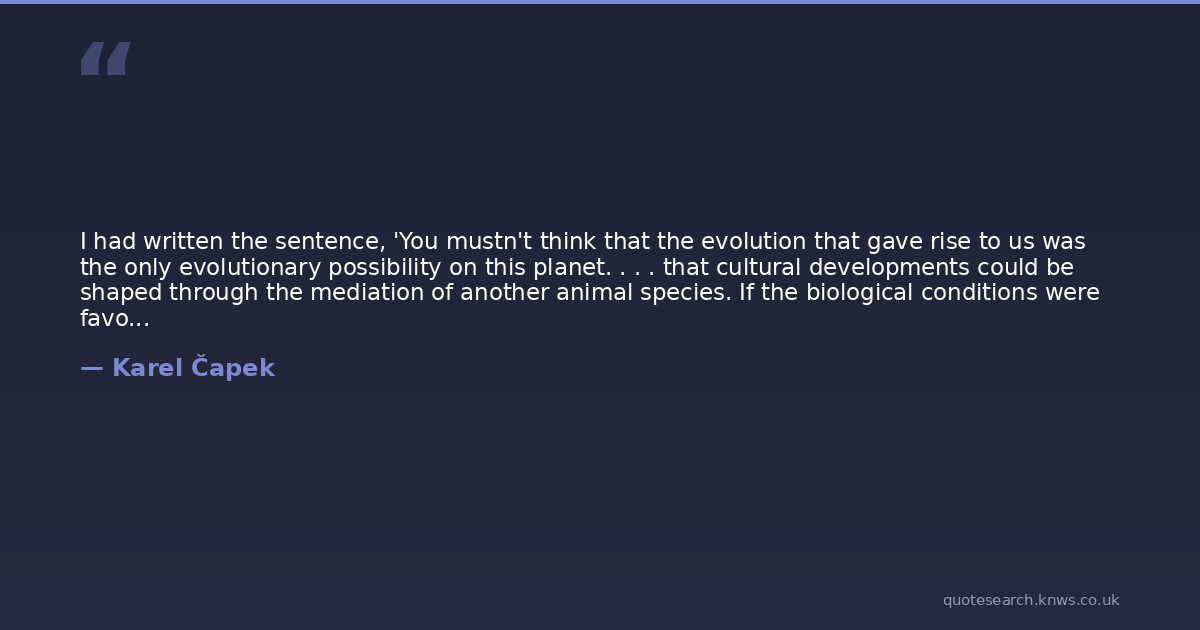 I had written the sentence, 'You mustn't think that the evolution that gave rise to us was the only evolutionary possibility on this planet. . . . that cultural developments could be shaped through the mediation of another animal species. If the biological conditions were favorable, some civilization not inferior to our own could arise in the depths of the sea. . . . Would it do the same stupid things mankind has done? Would it invite the same historical calamities? What would we say if some animal other than man declared that its education and its numbers gave it the sole right to occupy the entire world and hold sway over all creation?