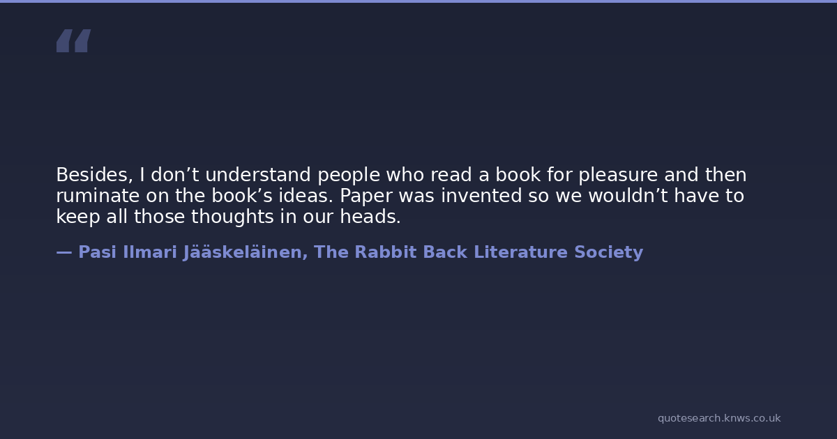 Besides, I don’t understand people who read a book for pleasure and then ruminate on the book’s ideas. Paper was invented so we wouldn’t have to keep all those thoughts in our heads.